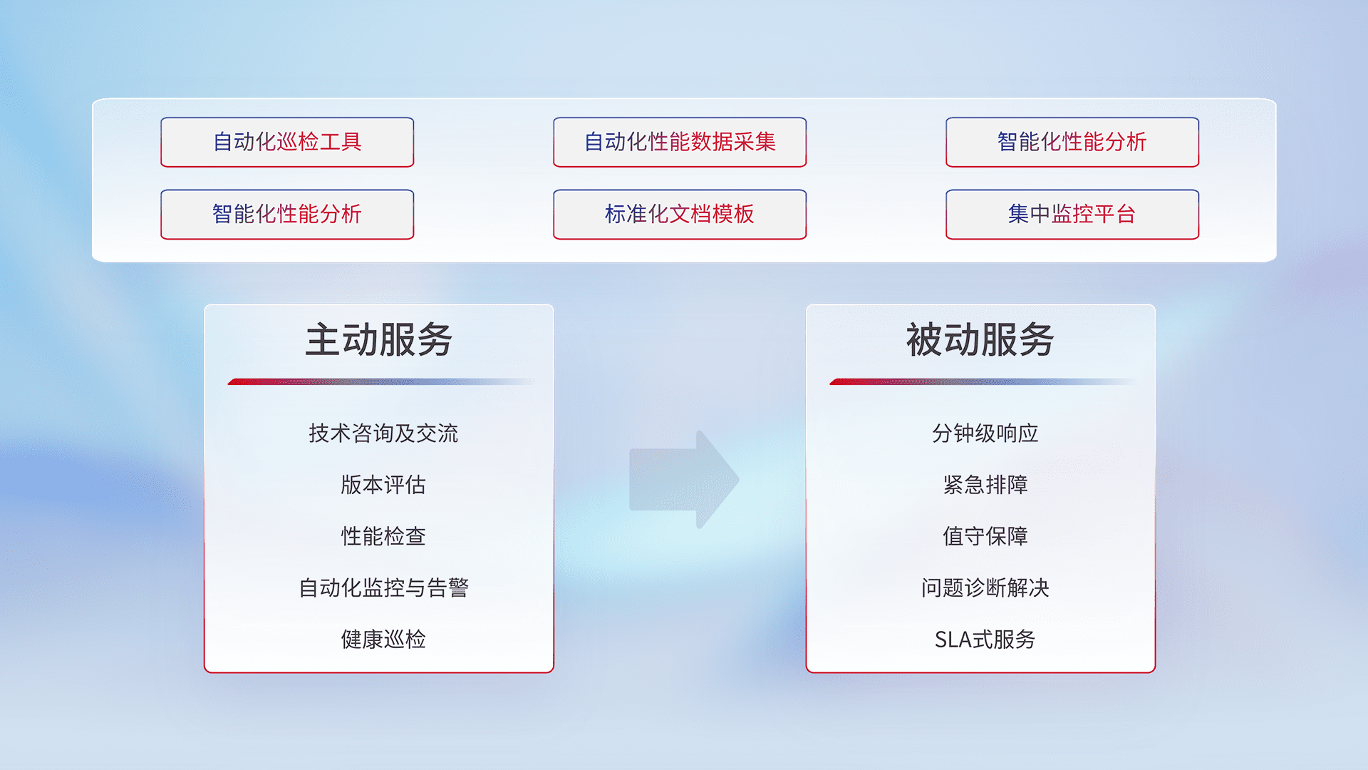 智能化工具和标准化文档,,,,保障服务质量,,,,提供主动服务(包含技术咨询、、、版本评估、、性能检查、、、、自动化监控与告警、、、、健康巡检)和被动服务包含(分钟级响应、、紧急排障、、、、值守保障、、问题诊断解决、、、、SLA服务)。。
